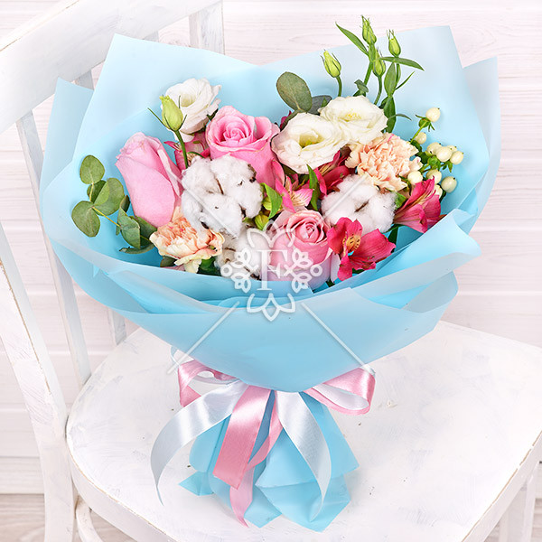 роза  розовая – 3 шт., альстромерия розовая – 2 шт., эустома белая – 3 шт., гвоздика персиковая – 2 шт., гиперикум белый – 1 шт., хлопок – 1 шт., зелень декоративная (эвкалипт), упаковка, лента.
